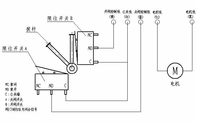 4)執(zhí)行機構(gòu)引出線中:紅色線為電機正極引出線,黑色線為電機負極引出線,黃色線為開閥到位引出線,藍色線為關(guān)閥到位引出線,白色線為閥到位公共線。