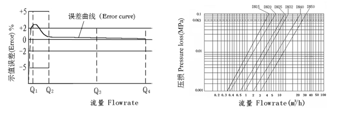 從分界流量到過載流量為:水溫≤30℃時(shí)為±2%,水溫>30℃且≤90℃時(shí)為±3% ; 從最小流量到分界流量(不包括分界流量)為±5%.