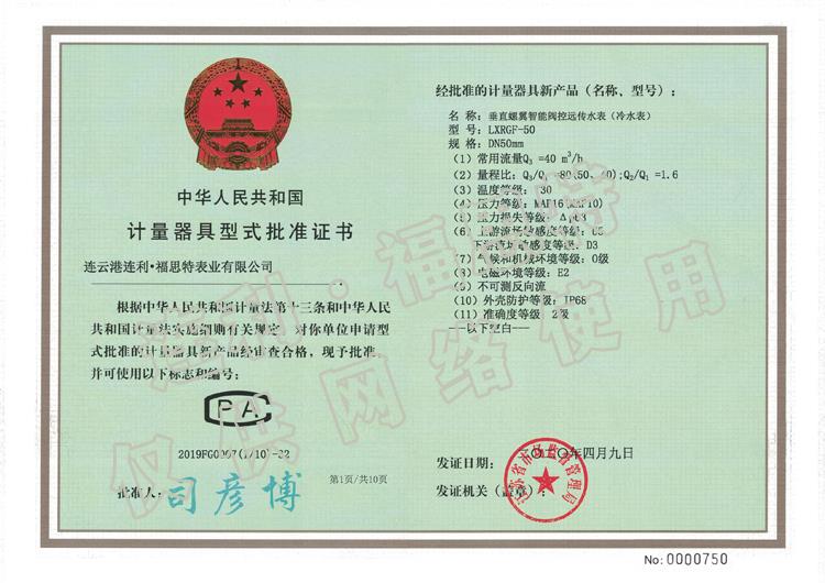 連云港連利·福思特表業(yè)有限公司新獲10類水表型批證書