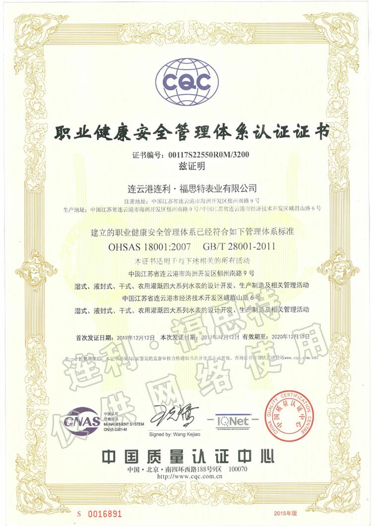 職業(yè)健康安全管理體系認證證書