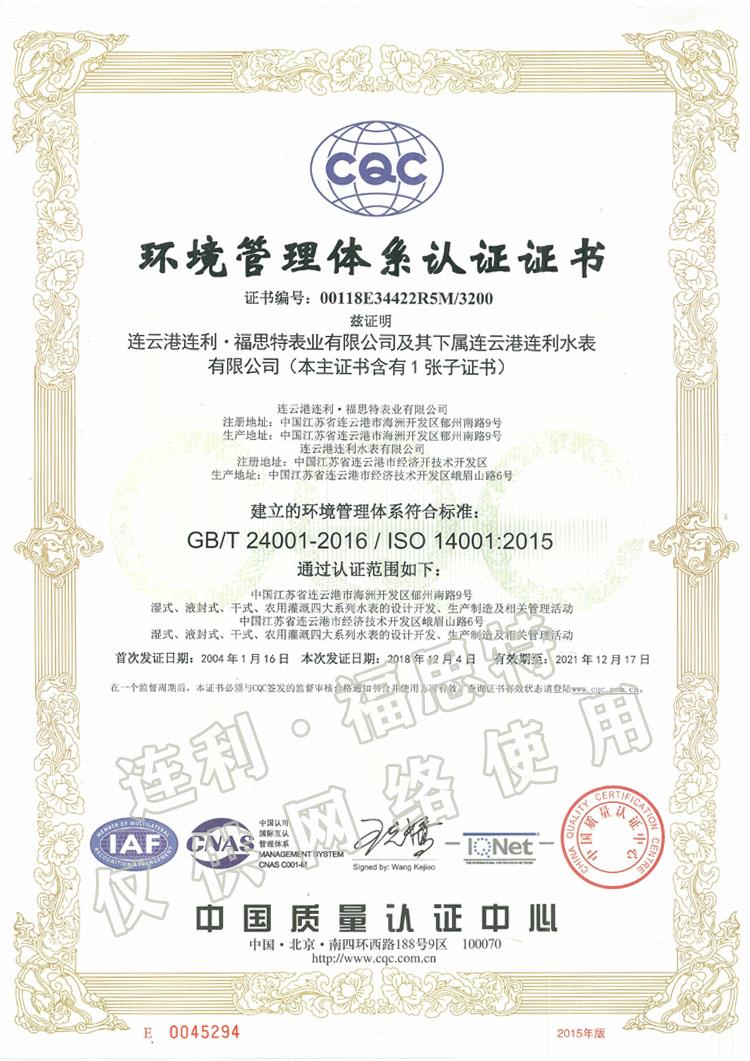 環(huán)境管理體系認證證書